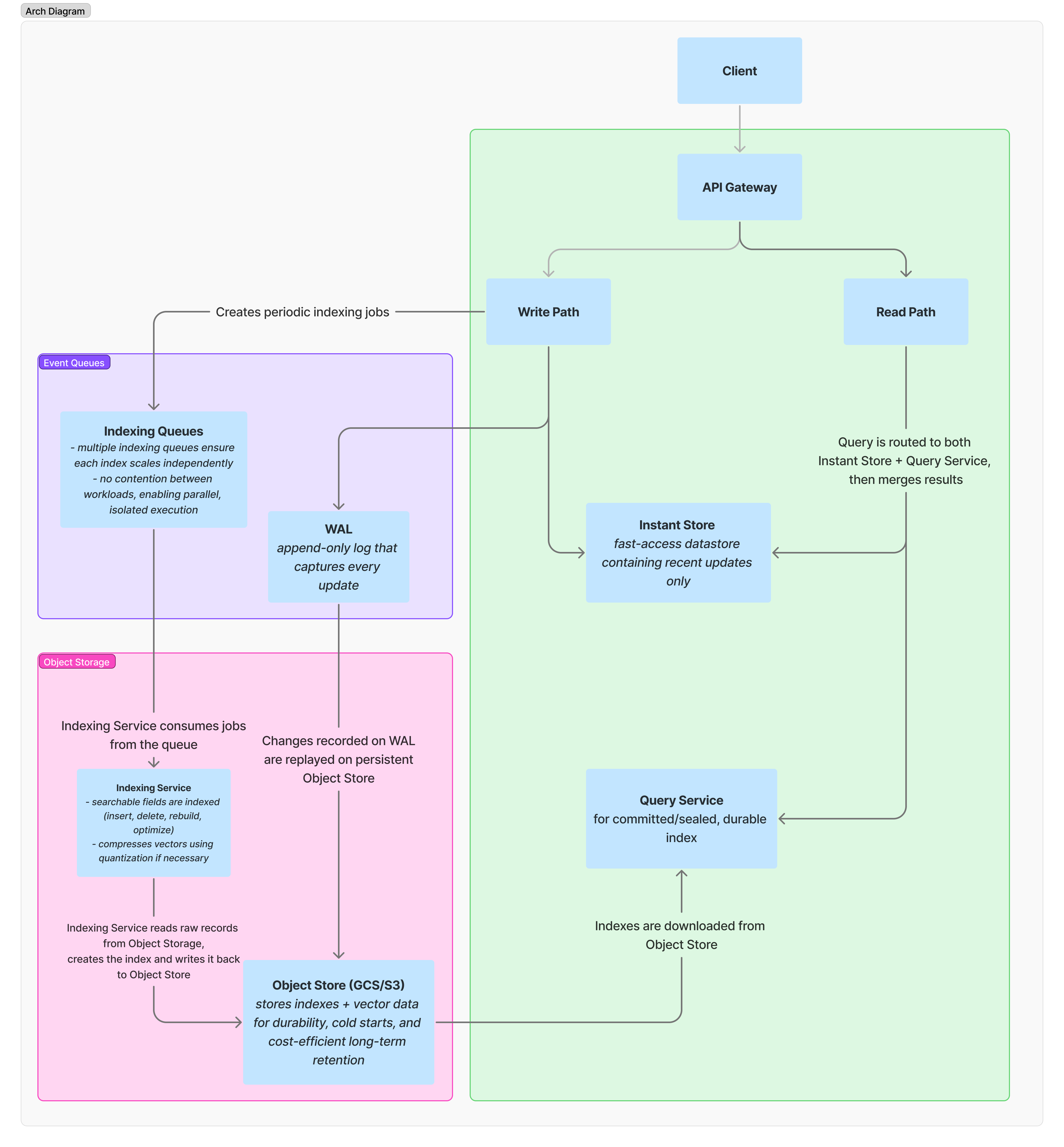 As the diagram shows, index state, vector data, and metadata are persisted to cloud object storage (GCS for now, S3 coming soon). Disk, cache, and in-memory storage layers each employ a usage-aware model for index lifecycle in which indexes are lazily loaded from object storage on demand and evicted when idle.