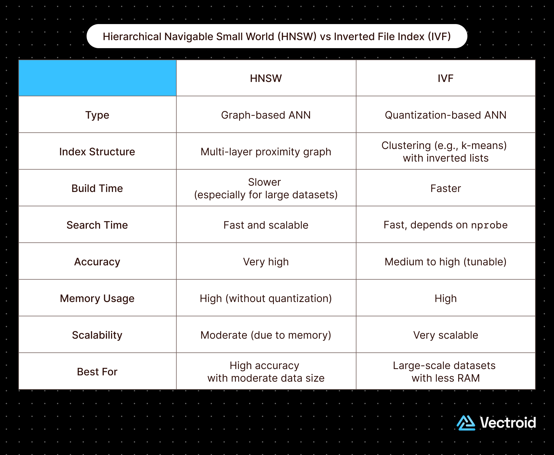 Before cutting into the details, a quick snapshot of HNSW versus IVF: