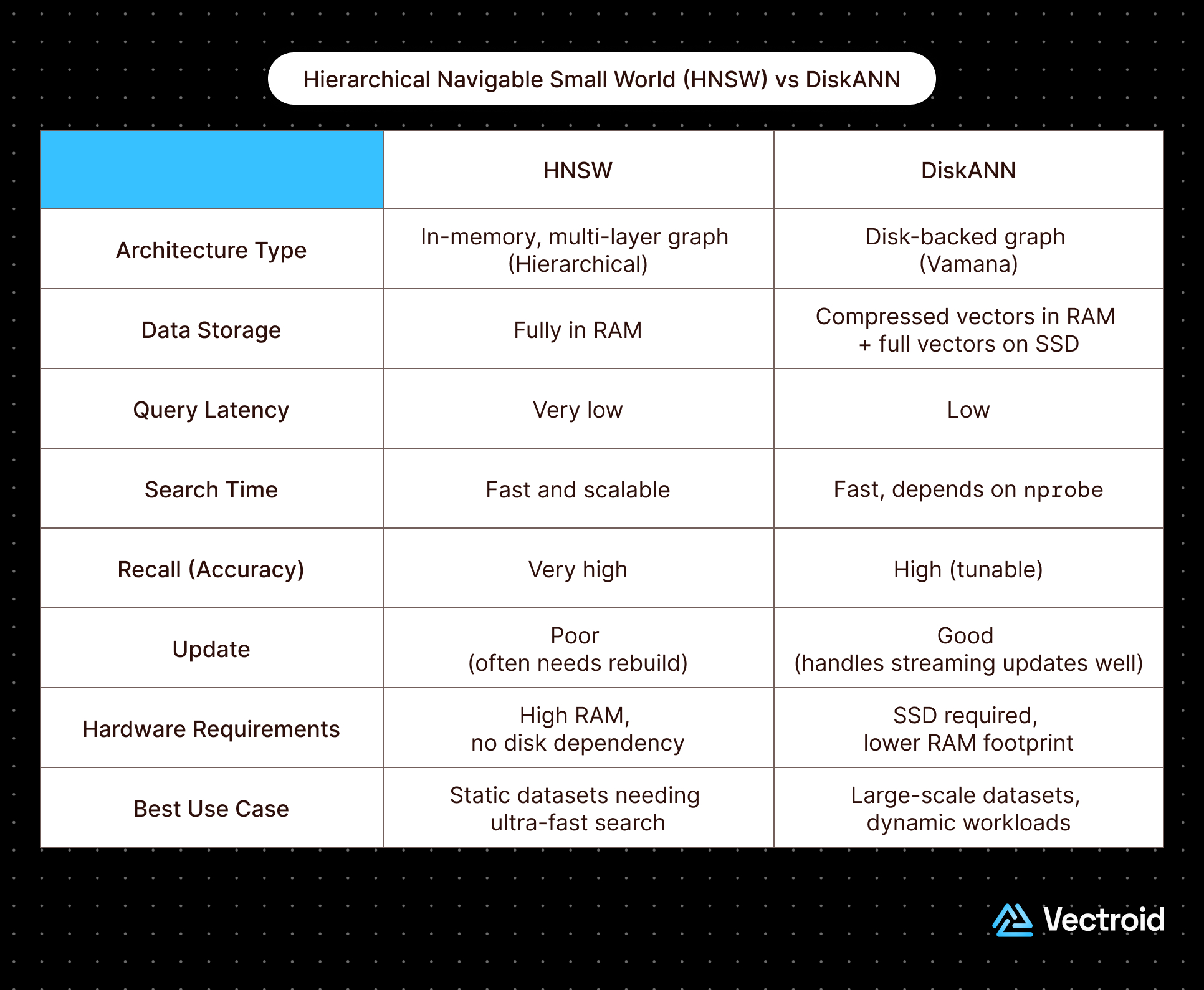 However, HNSW has its limitations. It consumes large amounts of memory since the full graph—including all vector data and edges—must reside in RAM. This becomes prohibitively expensive at billion vector scale. Its scalability is also limited because it is not designed for disk-based operation; extending it beyond RAM requires hybrid systems that diminish its performance. Deletions are also inefficient as they require tombstoning or a full rebuild.